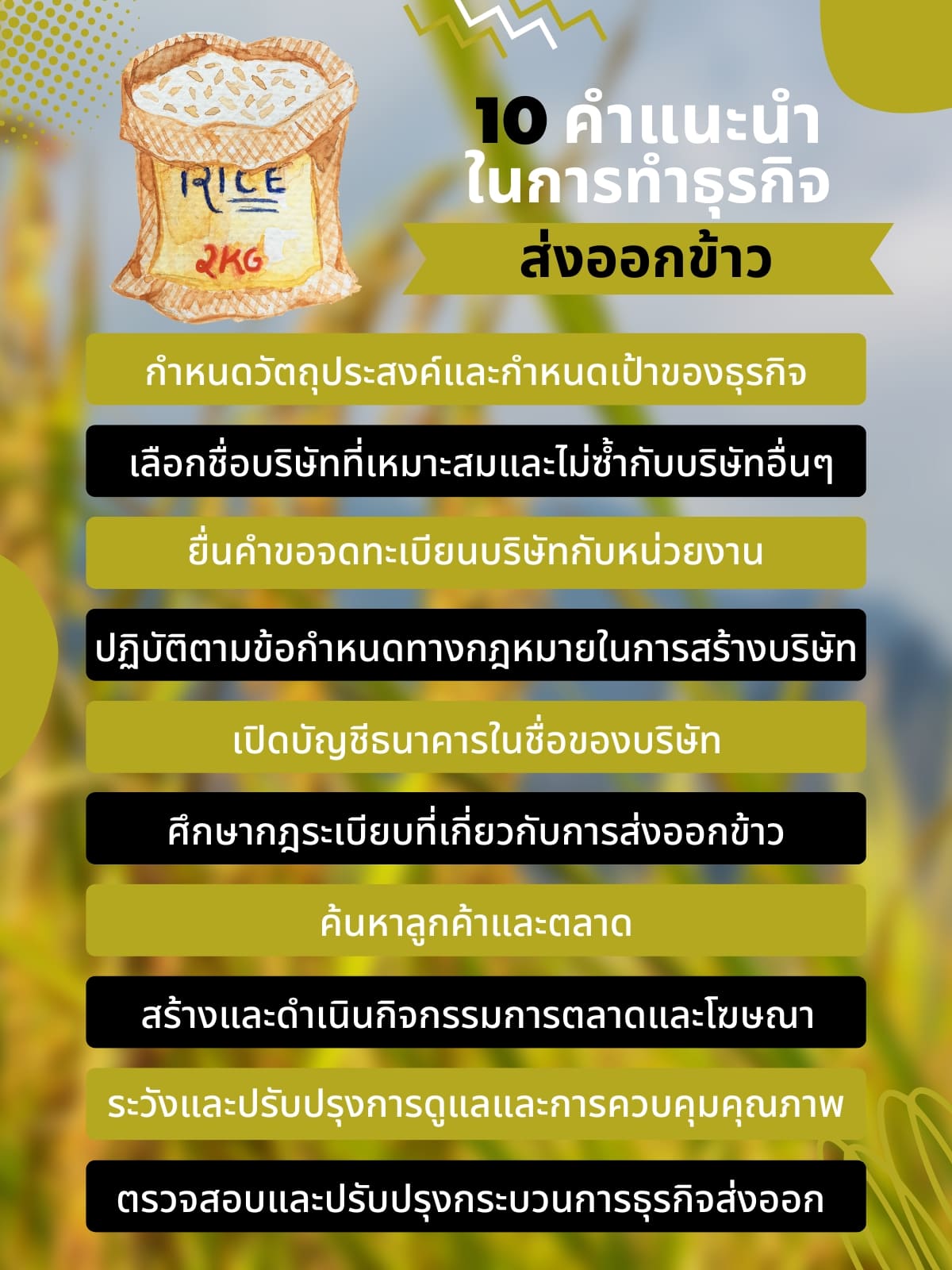 สร้างเครือข่ายและความสัมพันธ์ เข้าร่วมองค์กรหรือสมาคมที่เกี่ยวข้องกับธุรกิจส่งออกข้าว เพื่อเชื่อมโยงกับผู้นำเข้าและพันธมิตรทางธุรกิจ