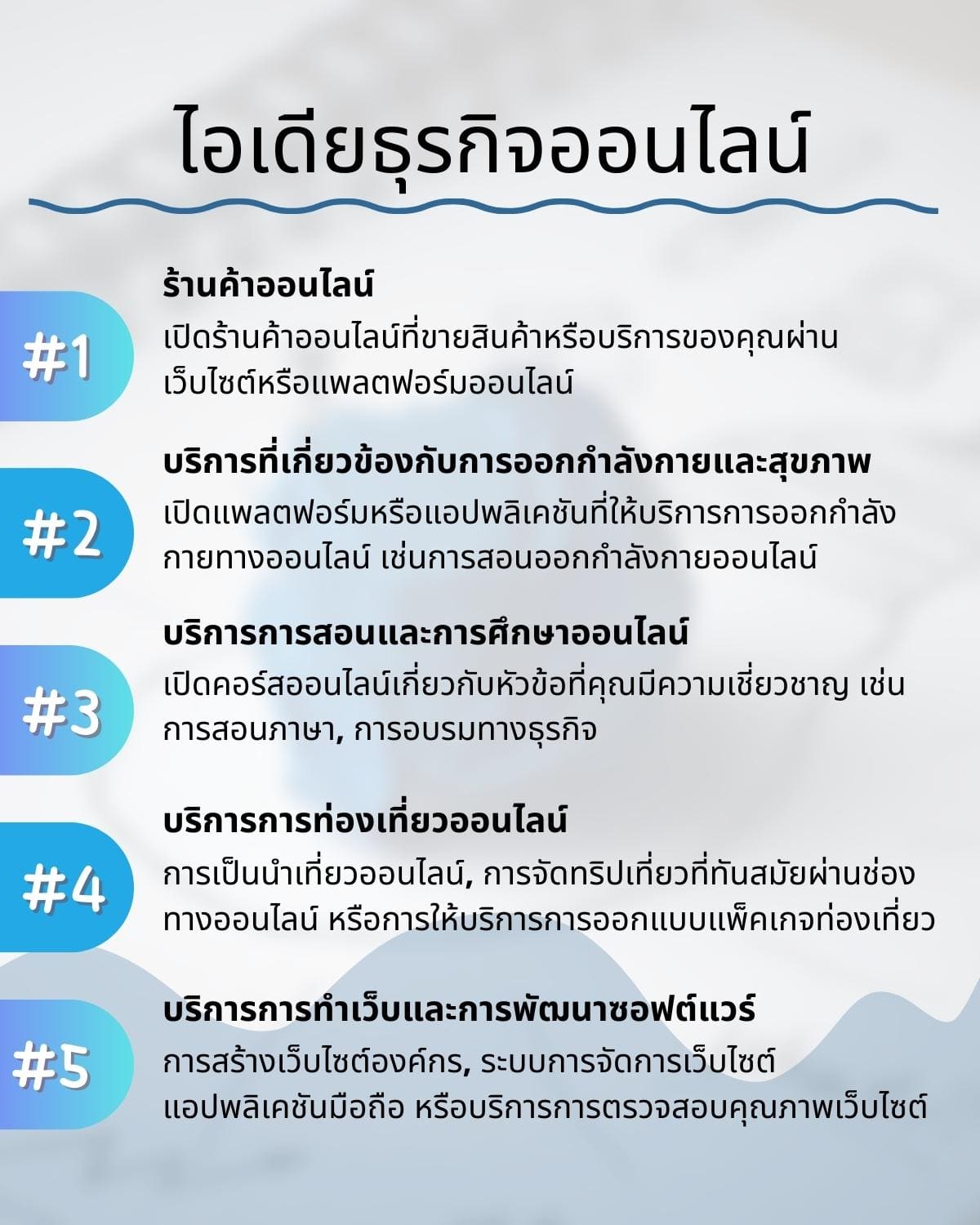 2. ธุรกิจออนไลน์ เริ่มต้นธุรกิจออนไลน์เช่นการขายสินค้าผ่านเว็บไซต์หรือแพลตฟอร์มออนไลน์ การให้บริการทางออนไลน์ เช่นการสอนออนไลน์ การให้คำปรึกษาทางออนไลน์ หรือการสร้างเนื้อหาและการตลาดออนไลน์