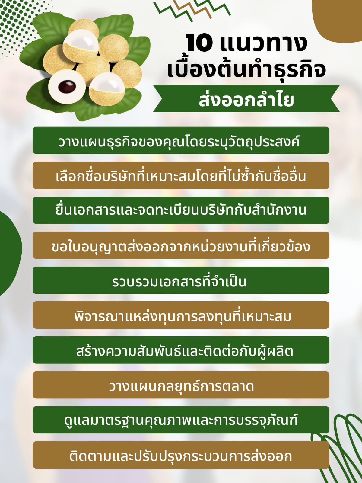 สร้างเครือข่ายทางธุรกิจ สร้างเครือข่ายทางธุรกิจที่เกี่ยวข้อง เช่น ผู้ผลิตลำไย, ตัวแทนจำหน่าย, หน่วยงานราชการและองค์กรที่สนับสนุนเพื่อสนับสนุนในกระบวนการส่งออก