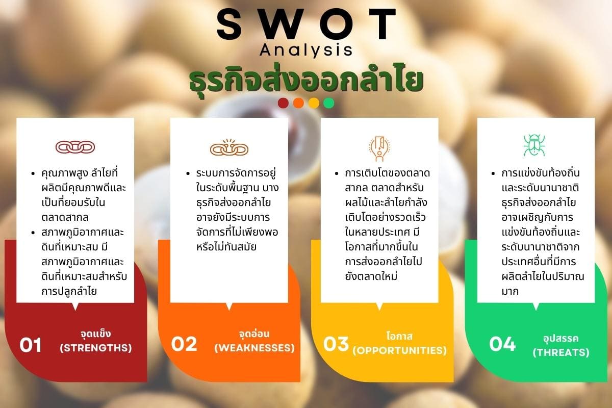 การวิเคราะห์ SWOT ช่วยให้ผู้ประกอบการส่งออกลำไยเข้าใจด้านที่มีแรงขึ้นและอ่อนลงของธุรกิจ รวมถึงโอกาสและอุปสรรคที่อาจส่งผลต่อธุรกิจในอนาคต อย่างไรก็ตาม ความสำเร็จของธุรกิจยังขึ้นอยู่กับวิธีการจัดการและการปรับตัวให้เหมาะสมต่อเป้าหมายและสภาพตลาดในแต่ละช่วงเวลา
