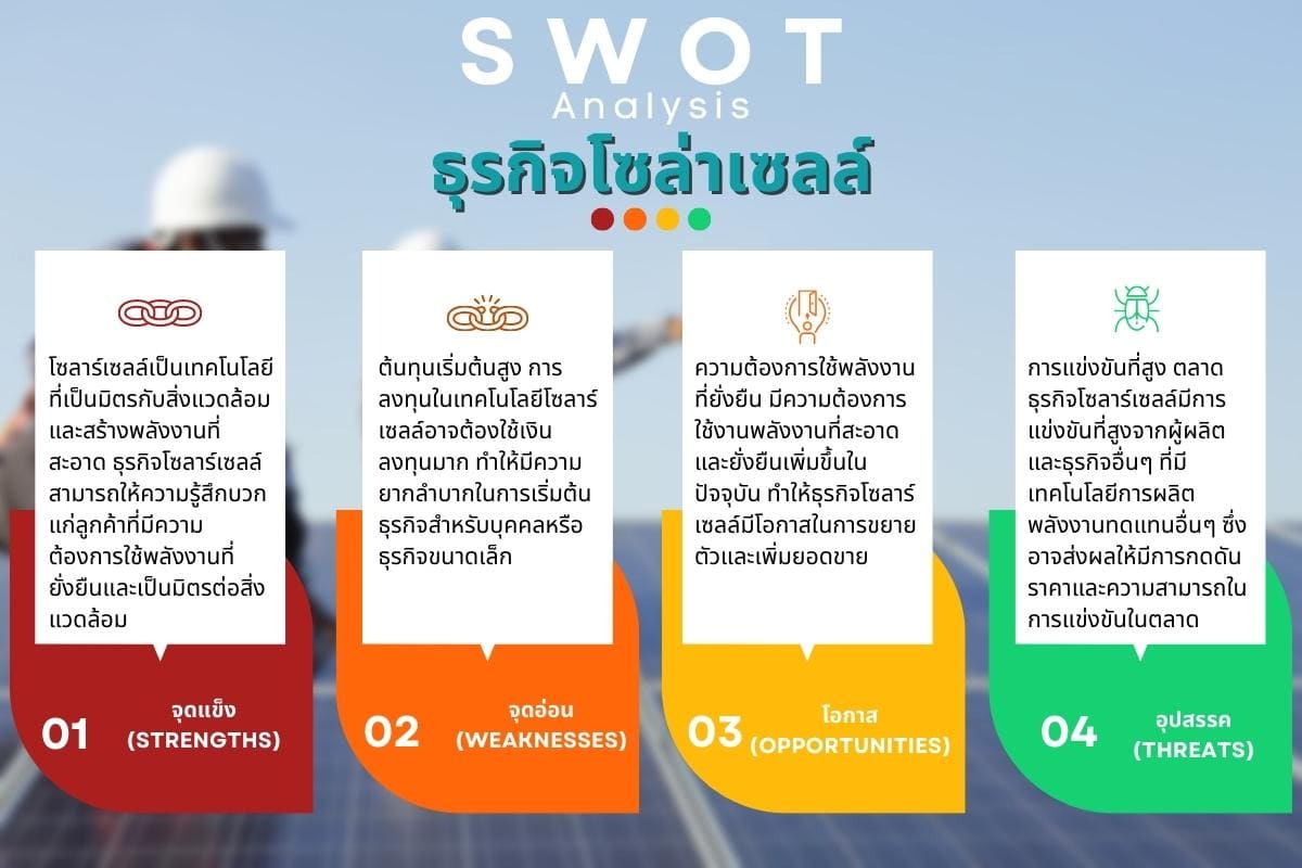 การวิเคราะห์ SWOT ช่วยให้ธุรกิจโซลาร์เซลล์เข้าใจแนวทางและโอกาสที่มีให้กับธุรกิจ รวมถึงจุดแข็งที่ต้องพัฒนาและอุปสรรคที่ต้องจัดการ เพื่อให้สามารถเติบโตและเหนือกว่าคู่แข่งในอุตสาหกรรมที่กำลังเติบโตอย่างรวดเร็วนี้ได้