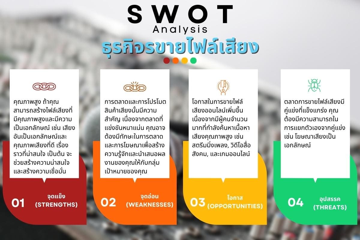 เมื่อนำเอา SWOT analysis มาวิเคราะห์การขายไฟล์เสียง คำอธิบายต่อไปนี้จะช่วยให้คุณเข้าใจและวิเคราะห์ SWOT อย่างละเอียดมากขึ้น