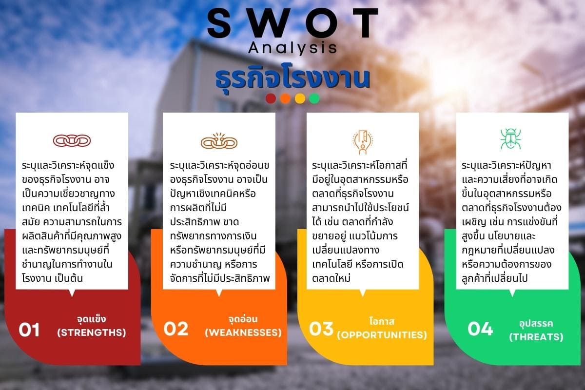 การวิเคราะห์ SWOT ช่วยให้ธุรกิจโรงงานเข้าใจแนวโน้มและสภาพแวดล้อมที่ร่วมเป็นประโยชน์หรือเสี่ยงต่อธุรกิจของตน เพื่อให้สามารถกำหนดกลยุทธ์และการดำเนินธุรกิจที่มีประสิทธิภาพและตอบสนองต่อความต้องการของตลาดได้อย่างเหมาะสม