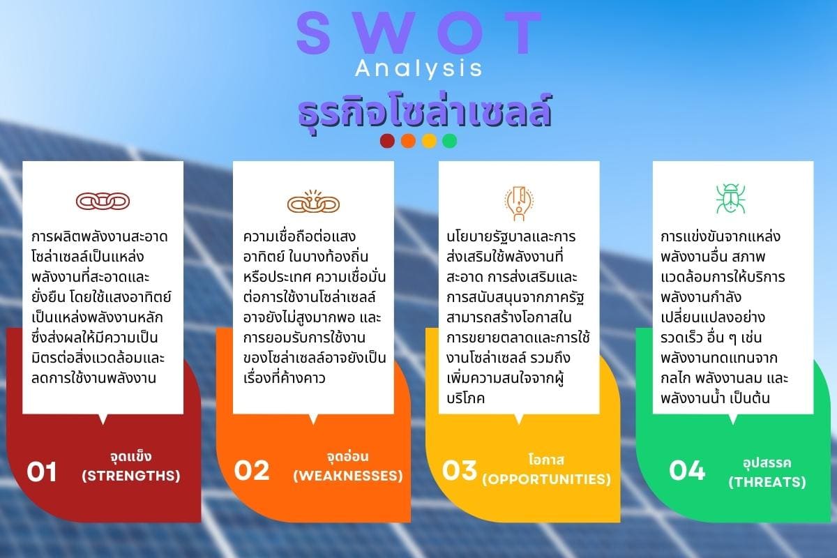 การวิเคราะห์ SWOT analysis ช่วยให้เห็นภาพรวมของกำลังและอุปสรรคที่เกี่ยวข้องกับอุตสาหกรรมโซล่าเซลล์ และช่วยในการวางแผนกลยุทธ์และการดำเนนอนเพื่อให้องค์กรหรือผลิตภัณฑ์โซล่าเซลล์มีการเตรียมความพร้อมและจัดการกับปัญหาที่อาจเกิดขึ้นในอนาคต